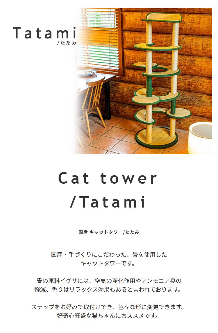 国産のキャットタワー【Tatami】たたみは、高品質な素材と職人の技術が光る一品です。日本の伝統的なたたみ素材を使用し、猫ちゃんにとって快適で安心感のある遊び場を提供します。
